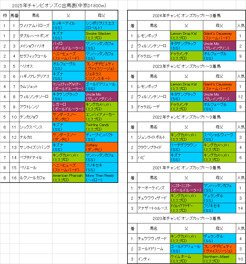 チャンピオンズカップの出走馬と過去5年の血統データを予想に役立つ見やすい色分け出馬表にまとめています。