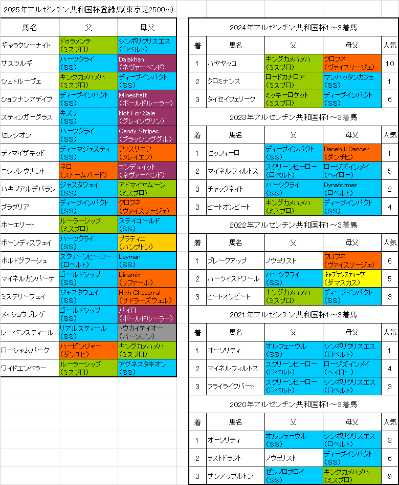 11月9日(日)に行われるアルゼンチン共和国杯2025東京芝2500mの出走予定馬(登録馬)と過去5年の血統データを予想に役立つ見やすい色分け表にまとめました。