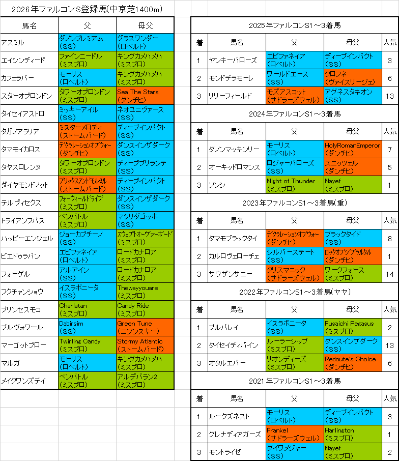 3月21日(土)に行われるファルコンステークス2026中京芝1400mの出走予定馬(登録馬)と過去5年の血統データを予想に役立つ見やすい色分け表にまとめました。