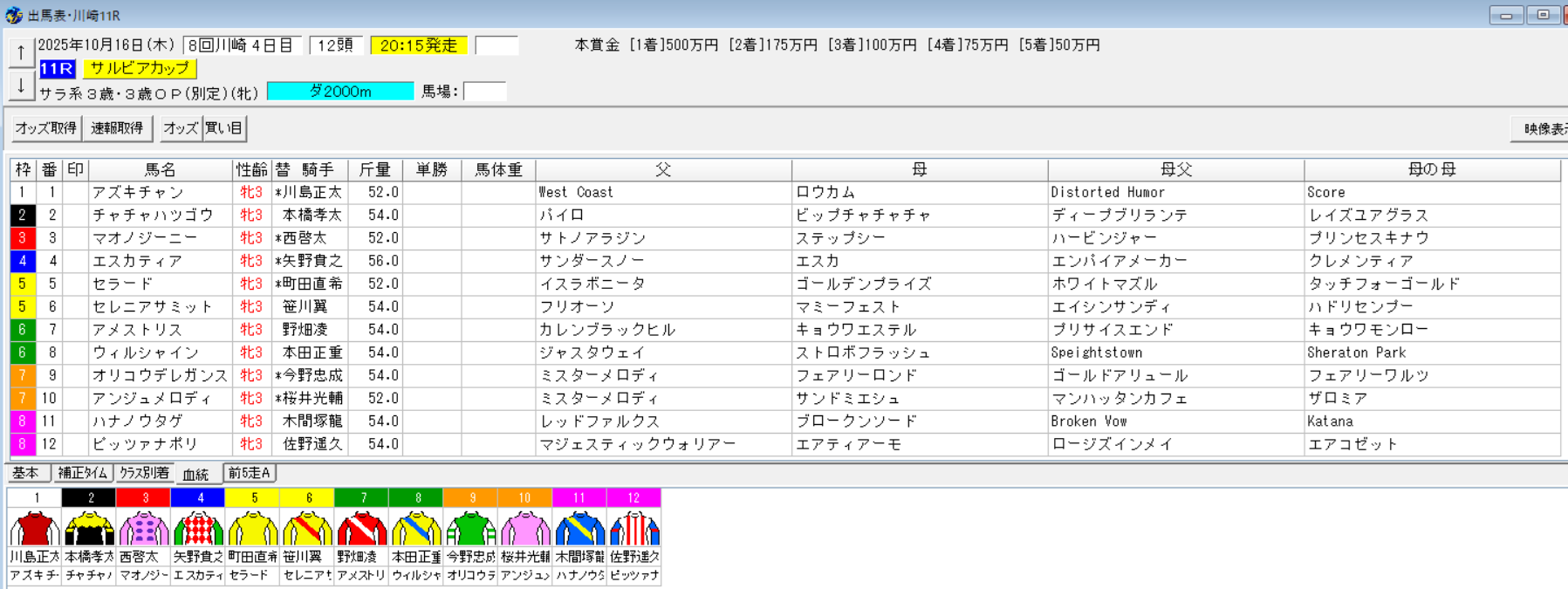 10月16日(木曜)に川崎競馬場で行われる【サルビアカップ2025】D2000mの予想です。