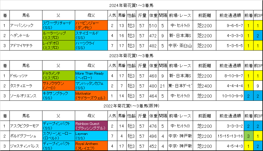 10月26日(日)に行われる菊花賞2025京都芝3000mの出走予定馬(登録馬)と過去5年の血統データを予想に役立つ見やすい色分け表にまとめました。