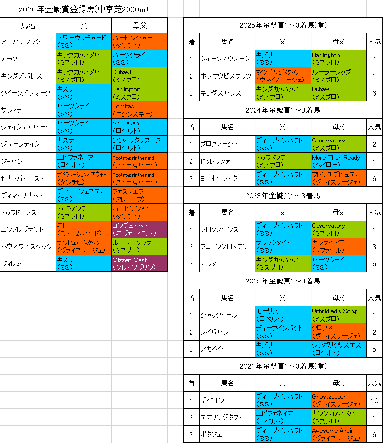 3月15日(日)に行われる金鯱賞2026中京芝2000mの出走予定馬(登録馬)と過去5年の血統データを予想に役立つ見やすい色分け表にまとめました。