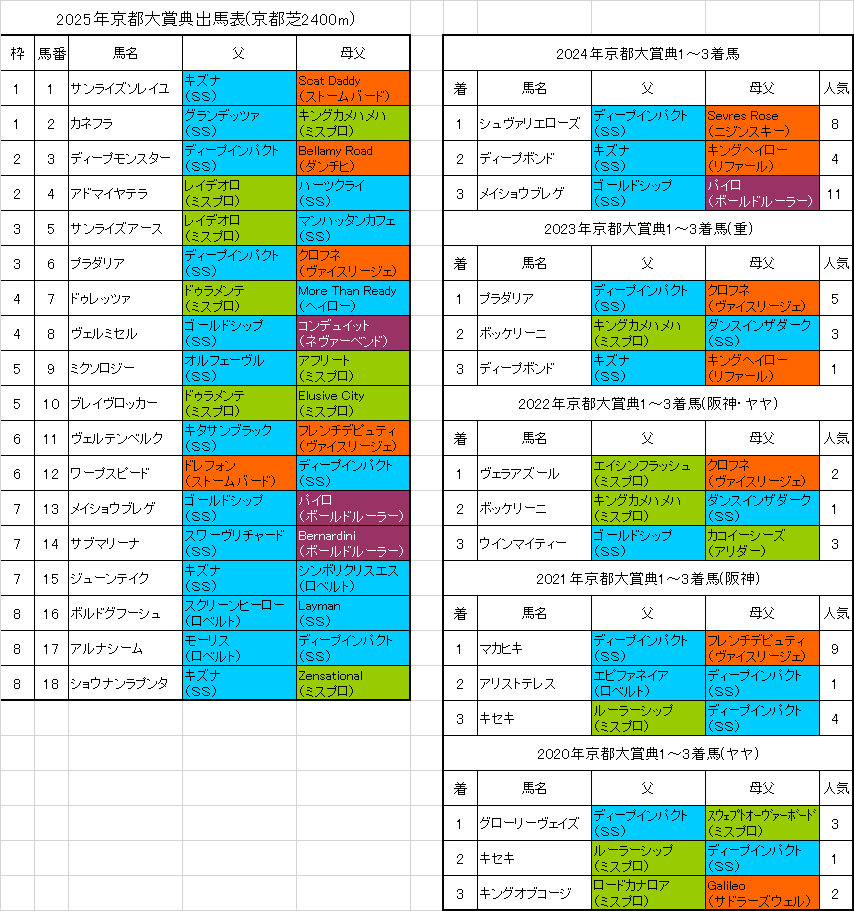 京都大賞典の出走馬と過去5年の血統データを予想に役立つ見やすい色分け出馬表にまとめています。