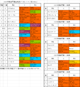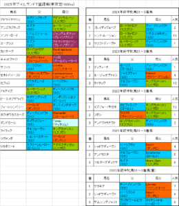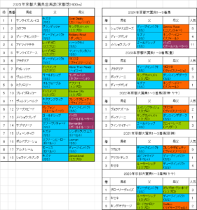 毎日王冠2025血統傾向と過去データ『馬体重は490kg以上』 10月5日(日)に行われる毎日王冠2025東京芝1800mの出走予定馬(登録馬)と過去5年の血統データを予想に役立つ見やすい色分け表にまとめました。 毎日王冠の血統データを分...