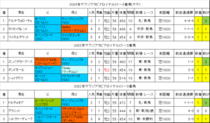 毎日王冠の出走馬と過去5年の血統データを予想に役立つ見やすい色分け出馬表にまとめています。