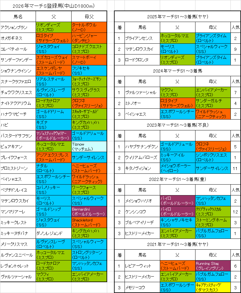 3月29日(日)に行われるマーチステークス2026中山D1800mの出走予定馬(登録馬)と過去5年の血統データを予想に役立つ見やすい色分け表にまとめました。