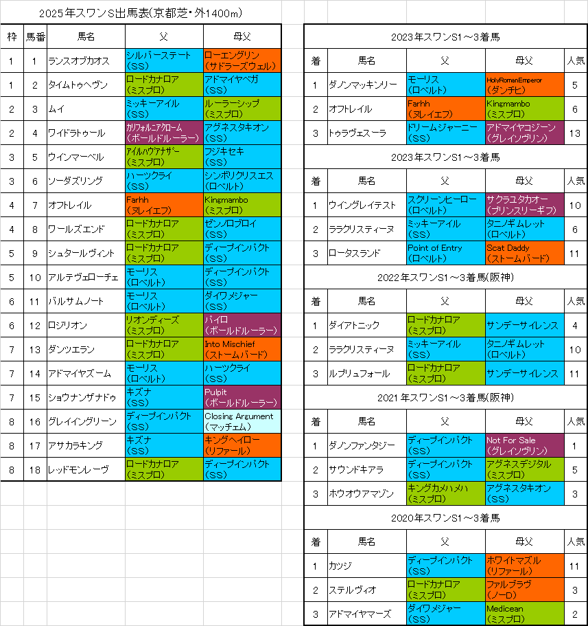 スワンSの出走馬と過去5年の血統データを予想に役立つ見やすい色分け出馬表にまとめています。