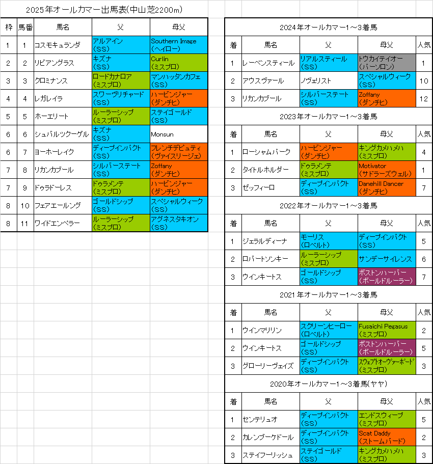 オールカマー2025の予想です。 オールカマーの出走馬と過去5年の血統データを予想に役立つ見やすい色分け出馬表にまとめています。 発走は9月21日(日)15時45分の予定です。 オールカマー2025の予想参考血統データ ★オールカマー2025出走馬と過去5年の血統... -